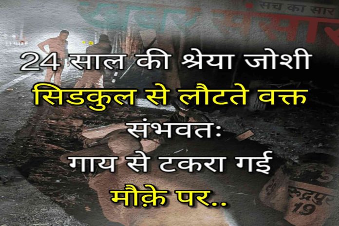 खबर संसार हल्द्वानी.24 साल की लड़की सिडकुल से वापसी एक्सीडेंट मेँ मौत 24 साल की श्रेया जोशी सिडकुल से लौटते वक्त संभवतः गाय से टकरा गई मौक़े पर गाय भी मृत पाई गई श्रेया को पीएसपी हॉस्पिटल ले जाया गया लेकिन बच नहीं पाई.लोगों का कहना है कि कल एक सिपाही का एक्सीडेंट हुआ था और लोगों का कहना है कि रिफ्लेक्टर और लाइट कि प्रॉपर व्यवस्था मेँ कमी है