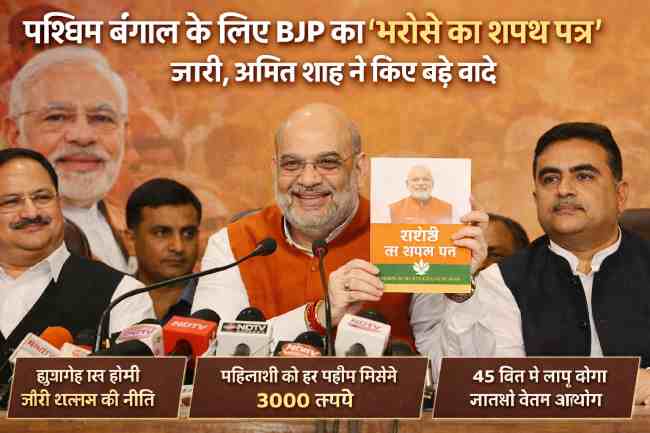 भारतीय जनता पार्टी ने शुक्रवार (10 अप्रैल 2026) को पश्चिम बंगाल चुनाव के मद्देनजर अपना घोषणापत्र जारी किया, जिसे ‘भरोसे का शपथ पत्र’ नाम दिया गया है। केंद्रीय गृह मंत्री अमित शाह ने इसे लॉन्च करते हुए कहा कि यह दस्तावेज राज्य के लोगों के लिए विश्वास और विकास का रोडमैप है। उन्होंने कहा कि यह संकल्प पत्र बेरोजगार युवाओं, महिलाओं और आम जनता को नई उम्मीद देगा और प्रधानमंत्री नरेंद्र मोदी के ‘विकसित भारत’ विजन को आगे बढ़ाने में मदद करेगा।