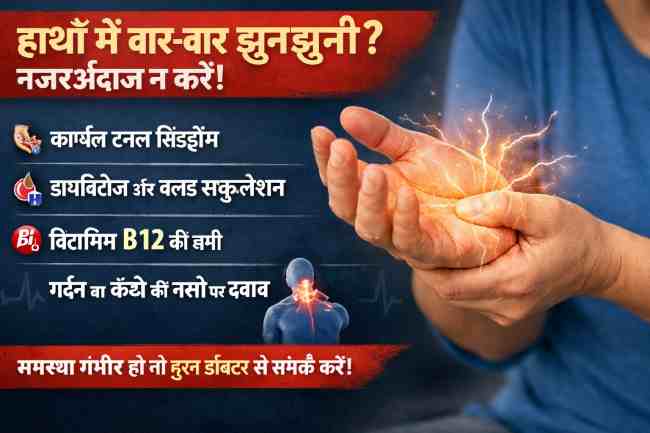 हाथों में बार-बार झुनझुनी या सुन्नपन महसूस होना एक आम समस्या लग सकती है, लेकिन कई बार यह शरीर का महत्वपूर्ण संकेत भी हो सकता है। विशेषज्ञों के अनुसार, इस तरह के लक्षणों को समझना और समय पर ध्यान देना बेहद जरूरी है।