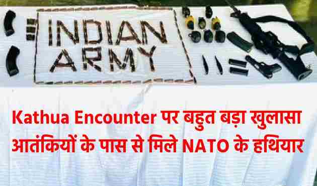 जम्मू कश्मीर के कठुआ में पाकिस्तान की एक बड़ी साजिश बेनकाब हुई है। कठुआ इनकाउंटर को लेकर जम्मू कश्मीर पुलिस ने एक बहुत बड़ा खुलासा किया है। एनकाउंटर में मारे गए आतंकियों के पास से नाटो के हथियार बरामद हुए हैं। आतंकियों के पास से एम4 कार्बाइन बरामद हुई है। जिसका इस्तेमाल नाटो की सेना के द्वारा किया जाता है।